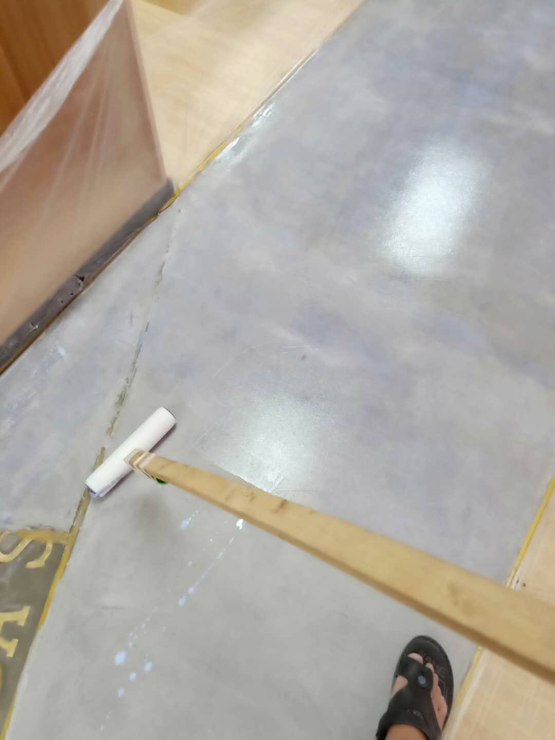 總計(jì)120平方的地面,先做水泥砂漿找平然后上面做復(fù)古地坪漆;批刮時(shí)注意不能有太多批刀印子,通常批刮2遍薄薄的批刮,等干了之后上面做復(fù)古地坪進(jìn)行著色;